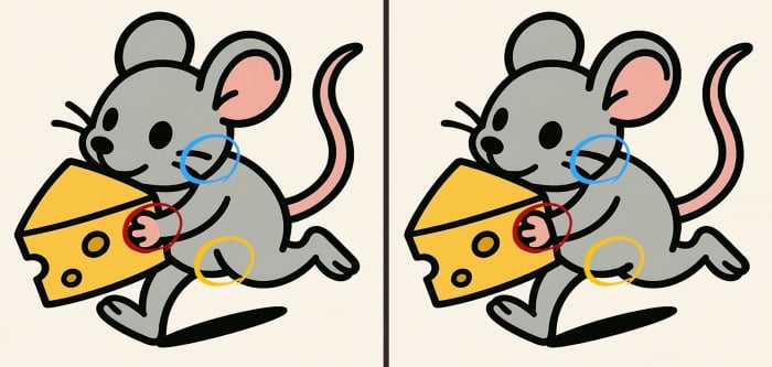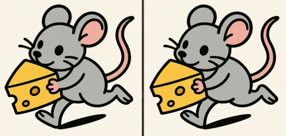 Na obrazku przedstawiającym mysz i ser ukryte są trzy subtelne różnice. Kluczem do sukcesu jest systematyczne skanowanie obrazu partiami, skupiając się na detalach, a nie na całości. Czas na rozwiązanie to zaledwie 31 sekund!