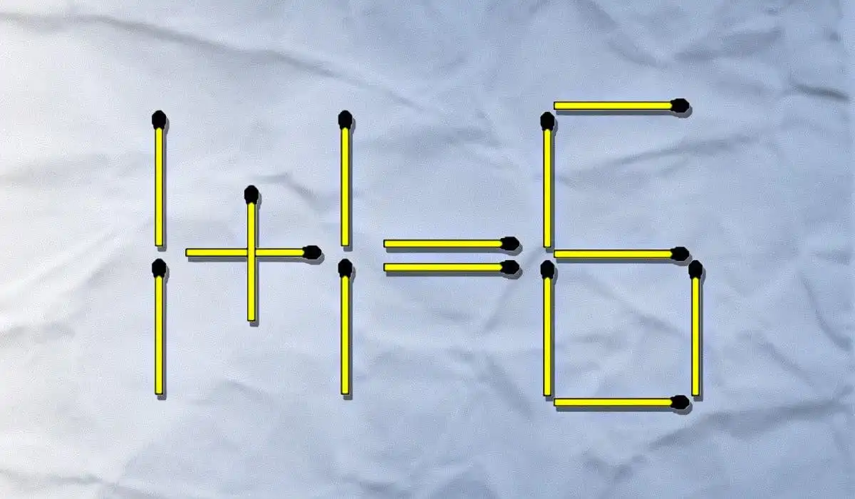 Twoim zadaniem jest naprawienie nieprawidłowego równania 1+1=6, używając zapałek. Możesz wykonać tylko dwie operacje: wyrzucić jedną zapałkę i przestawić drugą. Sekret tkwi w tym, że liczby to nie wartości, a kształty z ruchomych elementów.