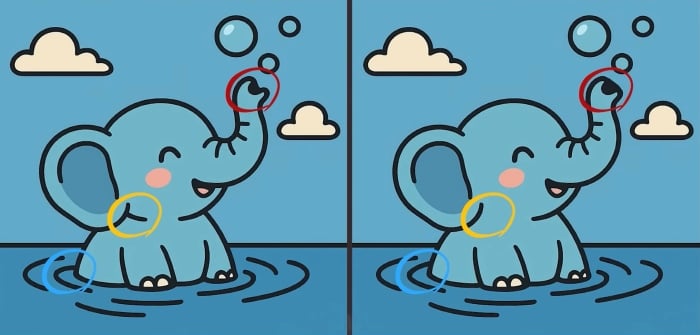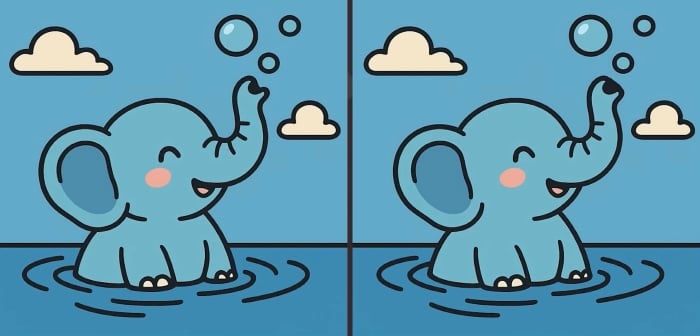 – Różnica 2 (Woda): Na lewym obrazku, na powierzchni wody przed trąbą słonia, unosi się pięć małych, okrągłych bąbelków. Na prawym obrazku jest ich tylko cztery – brakuje jednego bąbelka po prawej stronie tej grupy.