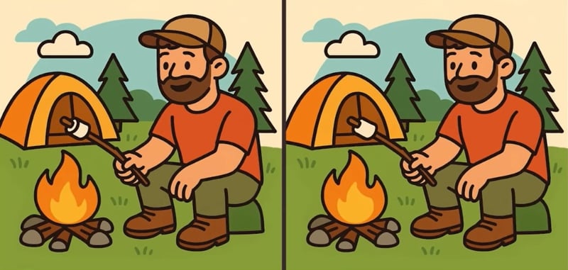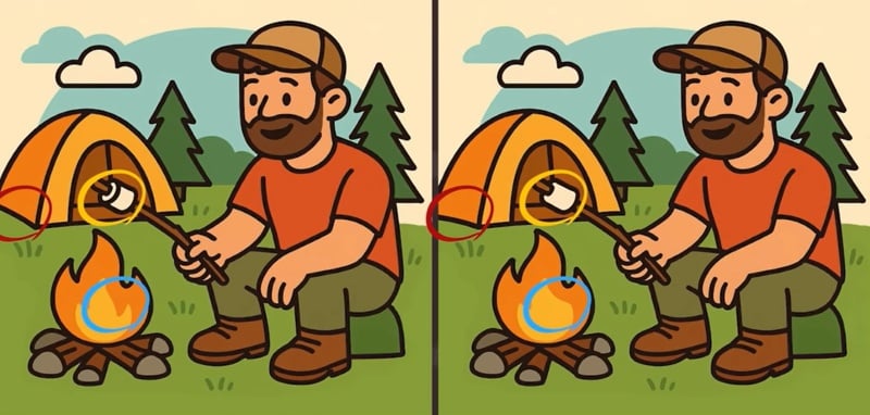 Wyobraź sobie relaksującą scenę: ciepły wieczór, ognisko trzaska, a mężczyzna z uśmiechem piecze pianki. Artysta przygotował dla ciebie dwie wersje tej sielankowej chwili. Na pierwszy rzut oka są one kopiami siebie. Ale to tylko złudzenie. W rzeczywistości, w gąszczu szczegółów – od płomieni przez ubranie po elementy tła – czają się trzy nieścisłości. Twoja misja, jeśli ją zaakceptujesz, polega na ich wyłowieniu w mniej niż minutę. To sprawdzian nie tylko wzroku, ale i koncentracji oraz umiejętności porównywania.