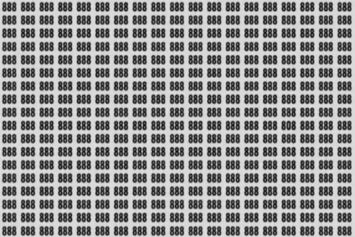 A teraz rozwiązanie. Jeśli nadal chcesz spróbować samodzielnie, zatrzymaj się tutaj. Gdy już przyjrzysz się obrazowi, zobaczysz, że liczby „888” są ułożone w rzędy i kolumny. Ukryta liczba „808” nie jest napisana innym kolorem czy fontem. Jest częścią tego samego ciągu znaków. Sekret tkwi w błędzie percepcyjnym: niektóre z cyfr „8” są napisane w taki sposób, że ich środkowe pętelki są bardzo małe lub niemal zamknięte, upodabniając je do zera. Szukaj pionowej sekwencji, gdzie środkowa cyfra w trójce wygląda na „ściśniętą” lub po prostu inną. Często jest to trzecia kolumna od prawej, gdzie środkowa z trzech ósemek (ta w centralnym rzędzie obrazu) wygląda jak zero, tworząc z górną i dolną ósemką ciąg „808”.