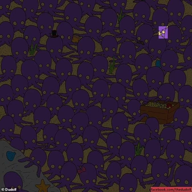 Gotowy, aby zobaczyć odpowiedź? Ryba ukryła się w prawej części obrazu. Jej wydłużone ciało i inny kształt głowy wyraźnie odcinają się od okrągławych głów ośmiornic. Oto rozwiązanie: