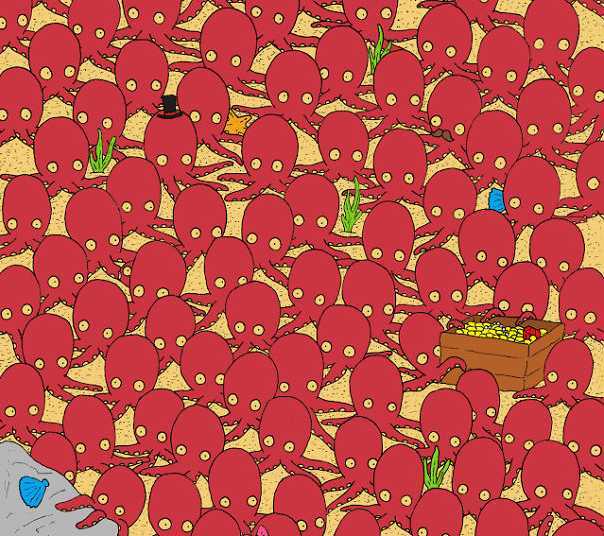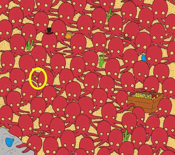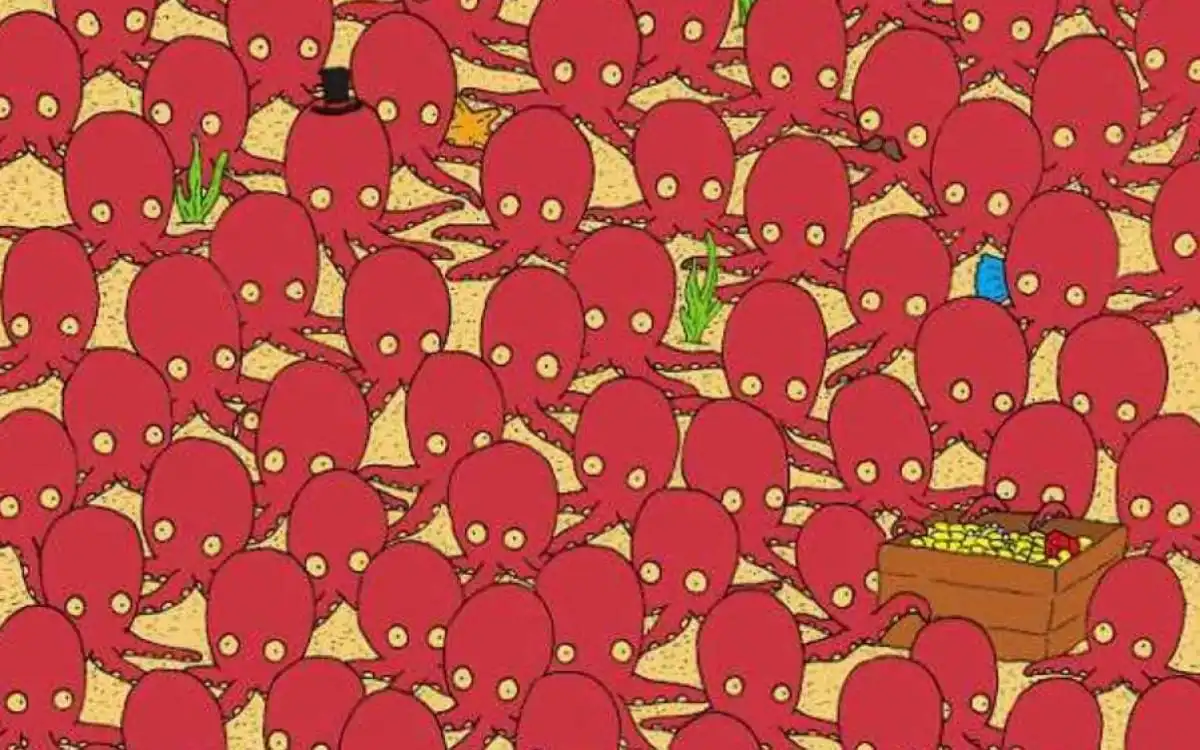 Wśród zatłoczonego dna morskiego, gdzie dziesiątki ośmiornic otaczają skarb, ukryła się jedna mała ryba. Twoim zadaniem jest dostrzec ją w zaledwie 7 sekund. Sekret tkwi w tym, by nie szukać kształtu, a różnicy w detalach – spojrzenie na środek obrazka i lewą stronę może okazać się kluczowe.