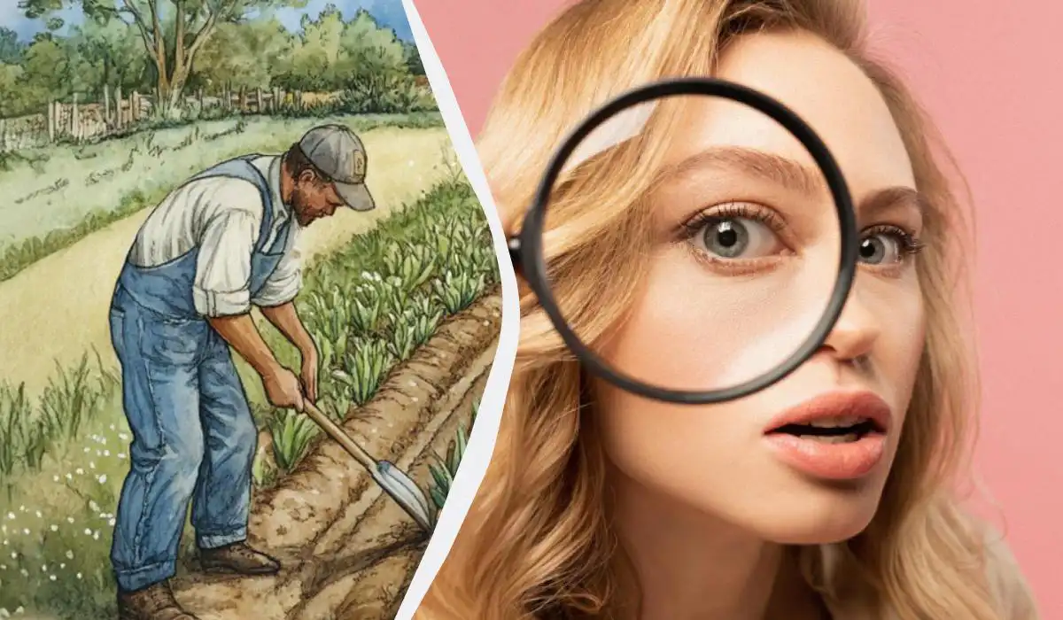 Na sielankowym obrazku trzech mężczyzn pracuje w polu, ale jeden z nich używa narzędzia, które kompletnie tu nie pasuje. Czy w ciągu czterech sekund uda Ci się dostrzec ten absurdalny szczegół?