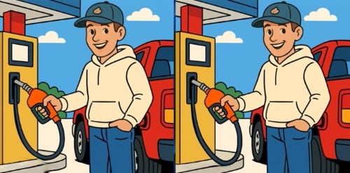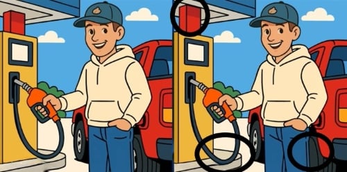 Pierwsza różnica znajduje się na dżinsach mężczyzny. Na jednym z obrazków ma on widoczną plamę lub łatę na kolanie, której brakuje na drugim zdjęciu. Druga zmiana dotyczy tablicy rejestracyjnej samochodu. Cyfra lub litera na tablicy jest inna. Trzecia, często najtrudniejsza do zauważenia, jest na dystrybutorze paliwa. Liczba wskazująca litry lub cenę (na wyświetlaczu) różni się między obrazkami. Rozwiązanie polegało na przejściu od ogółu do szczegółu i sprawdzeniu każdego segmentu sceny osobno.