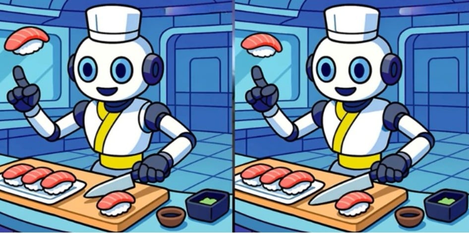 Przed tobą klasyczna łamigłówka na spostrzegawczość: dwa niemal identyczne obrazki robota sushi, między którymi ukryto trzy subtelne różnice. Twoje zadanie? Znaleźć je wszystkie w zaledwie 23 sekundy. Kluczem do sukcesu jest systematyczne skanowanie obrazu partiami, a nie chaotyczne szukanie.