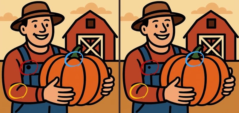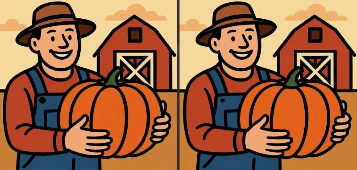 Dwa pozornie identyczne obrazki przedstawiające rolnika z dynią kryją w sobie trzy subtelne różnice. To wyzwanie na spostrzegawczość, które wymaga skupienia i uważnego porównania każdego detalu – od kształtów po cienie. Sekret rozwiązania tkwi w systematycznym skanowaniu obrazów fragment po fragmencie.