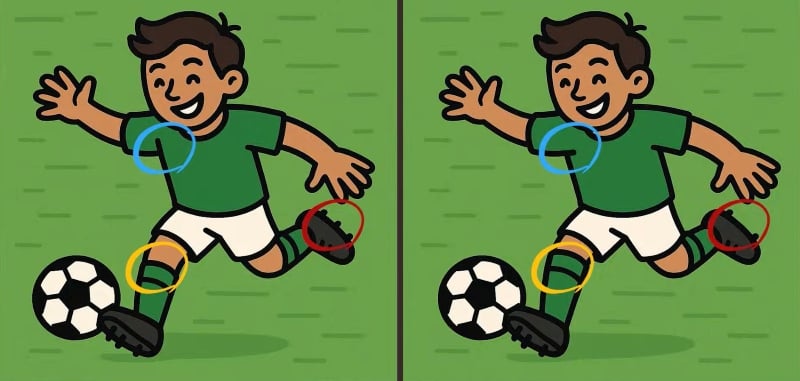 - – Różnica 3: Zwróć uwagę na tło, szczególnie na linie lub cienie za plecami piłkarza. Na jednym obrazku jedna z tych linii jest krótsza, brakuje jej lub ma inny kolor.
