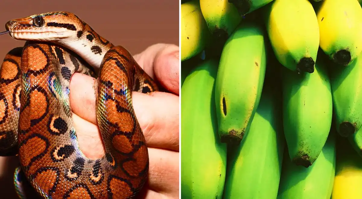 Wśród żółtej góry bananów czai się sprytnie zakamuflowany wąż. Jego głowa z charakterystycznymi kłami jest kluczem do rozwiązania – spróbuj skupić wzrok na lewej części obrazu, a nie na całym stosie.