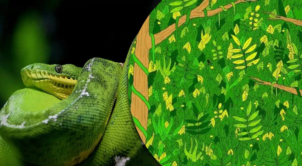 Obraz to morze zieleni – liście, pnącza, cienie. Twój umysł automatycznie grupuje je w jednolitą całość. To właśnie tam, wykorzystując naszą naturalną skłonność do uogólniania, ukrył się wąż. Jego kamuflaż jest niemal doskonały. Większość ludzi potrzebuje na to zadanie ponad 10 sekund, wpatrując się bezradnie w ekran. Ale ty możesz być w tym jednym procencie, który widzi więcej.