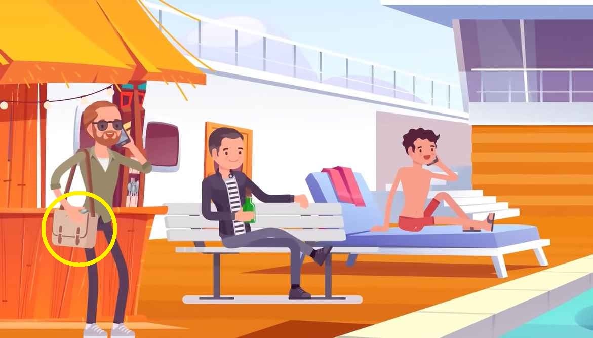 Rozwiązanie jest prostsze, niż się wydaje. Złodziejem jest mężczyzna w okularach słonecznych, siedzący po prawej stronie. Dlaczego? Podczas gdy pozostali korzystają z przedmiotów typowych dla relaksu przy basenie (telefon, drink), on w widoczny sposób chowa do kieszeni szorty sztućce – widelec i nóż – które najwyraźniej wziął z pobliskiego bufetu lub stołu. W kontekście plażowym jest to działanie całkowicie nieuzasadnione i wskazuje na przywłaszczenie sobie cudzej własności.