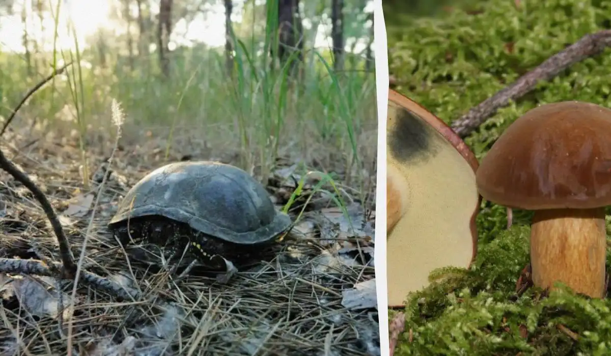 A teraz rozwiązanie. Grzyb nie znajduje się daleko od żółwia, ale jest doskonale zakamuflowany. Ukrywa się pod jednym z liści w prawym dolnym rogu obrazu. Jego biały trzon i fragment kapelusza wystają spod suchych liści, wtapiając się w tło. Kluczem było nie dać się zwieść oczywistości i przeszukać detale tła.