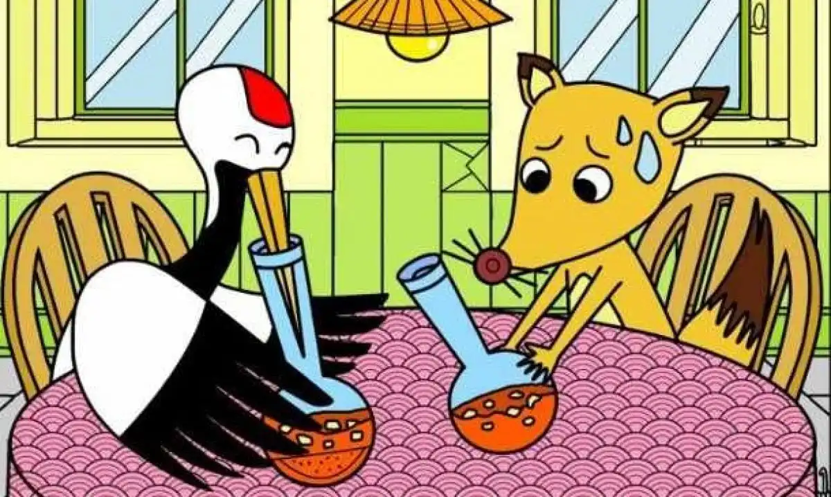 Czy pamiętasz bajkę, w której lis zaprosił żurawia na obiad, serwując mu zupę na płaskim talerzu, a ten w rewanżu poczęstował lisa przysmakiem z wąskiego dzbanka? Ta właśnie scena została uwieczniona na obrazku. Żuraw z gracją sięga dziobem do wysokiego naczynia, podczas gdy lis zrezygnowany obserwuje swój pusty, płaski talerz. Całość jest pełna detali: trawa, kamienie, liście. I właśnie wśród tych wszystkich szczegółów artysta ukrył parasol. Nie jest to jednak typowe poszukiwanie małego przedmiotu. Parasol jest częścią krajobrazu, jego kontury zostały sprytnie wkomponowane w inne kształty. To test Twojej uwagi i umiejętności dostrzegania patternów, które nie pasują do kontekstu.