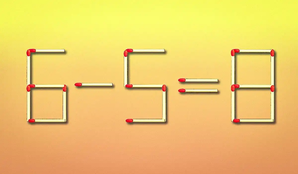 Klasyczna łamigłówka z zapałkami, która testuje twoje myślenie poza schematami. Oryginalne równanie 6 – 5 = 8 jest oczywiście błędne. Kluczem do sukcesu jest nie tylko poprawa działania, ale także zmiana sposobu, w jaki postrzegasz kształty cyfr ułożonych z zapałek. Czasem rozwiązanie leży w przekształceniu jednej cyfry w inną.