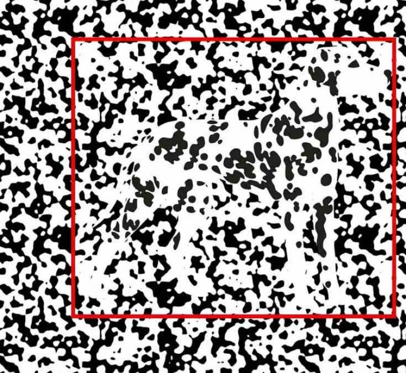 Wśród chaotycznego wzoru czarnych i białych kropek ukryta jest sylwetka psa. Kluczem do sukcesu jest zmiana perspektywy – zamiast skupiać się na pojedynczych punktach, spróbuj dostrzec cały kształt, który wyłania się z tła.