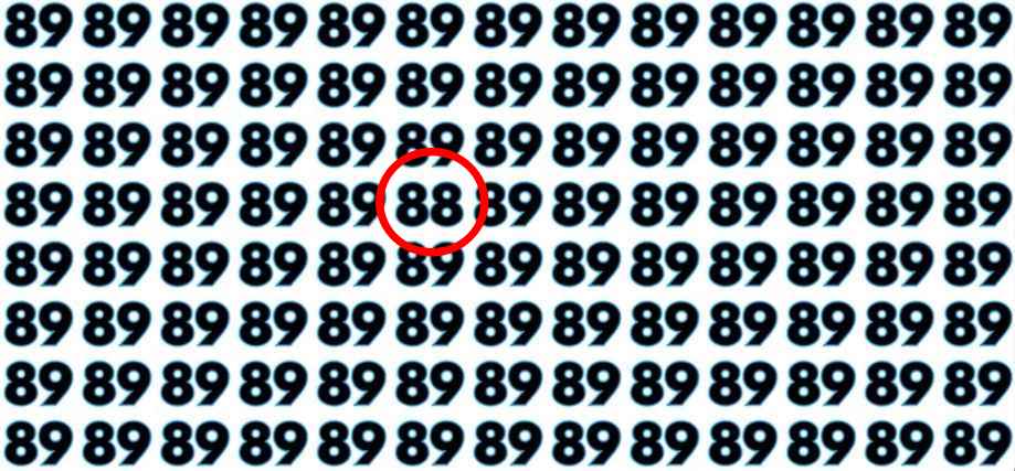 Teraz czas na rozwiązanie. Inna liczba to 88. Znajduje się w środkowych rzędach siatki. Dlaczego tak trudno ją dostrzec? Ponieważ nasz mózg, widząc dominujący wzór „89”, zakłada, że wszystkie kombinacje dwóch cyfr to właśnie „89”. Krótka, sekwencyjna kontrola każdej liczby z osobna natychmiast ujawnia intruza.