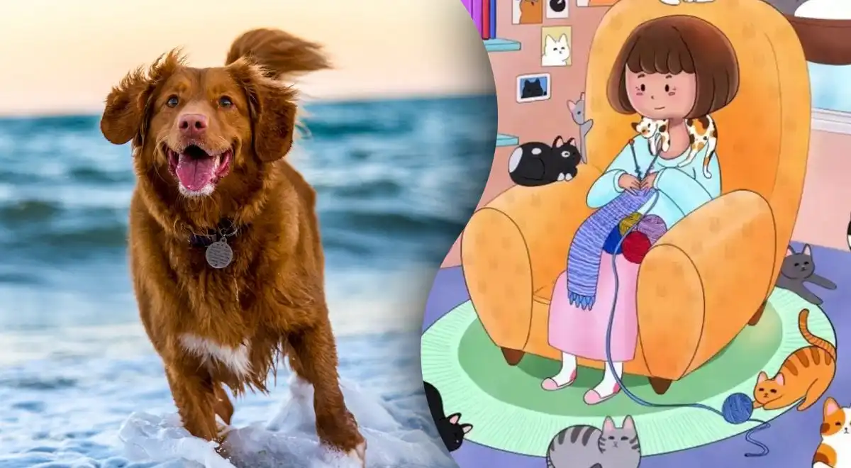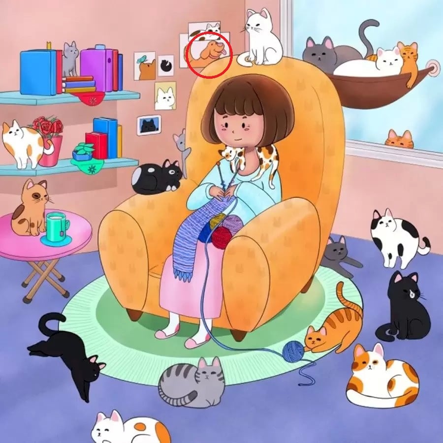 Gotowy na rozwiązanie? Pies nie biega między kotami. To byłoby zbyt oczywiste. Sprytnie ukrył się… na ścianie. Za plecami dziewczyny wisi galeria małych obrazków i fotografii. Większość z nich przedstawia koty – to logiczne w „królestwie”. Jednak jeden z tych obrazków, umieszczony w centralnym punkcie tej miniaturowej galerii, przedstawia psa! To właśnie ten pies jest rozwiązaniem zagadki. Nasz mózg, oszołomiony mnogością prawdziwych kotów w pomieszczeniu, automatycznie zakłada, że wszystkie obrazki też muszą przedstawiać koty. To klasyczny błąd uogólniania i pomijania szczegółów.