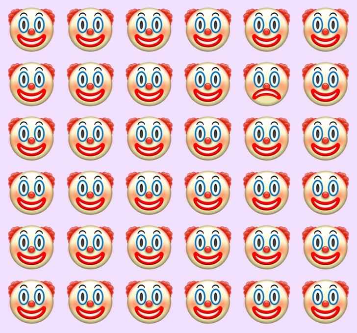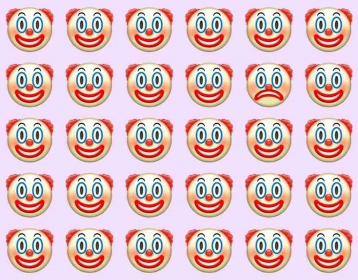 Wśród morza identycznych, szeroko uśmiechniętych buziek kryje się jedna, która wyraża zupełnie inne uczucie. Twoim zadaniem jest dostrzec tę drobną, ale kluczową różnicę w uśmiechu, która zdradza smutną emotikonę. Sekret tkwi w skrupulatnym skanowaniu wzrokiem każdego rzędu.