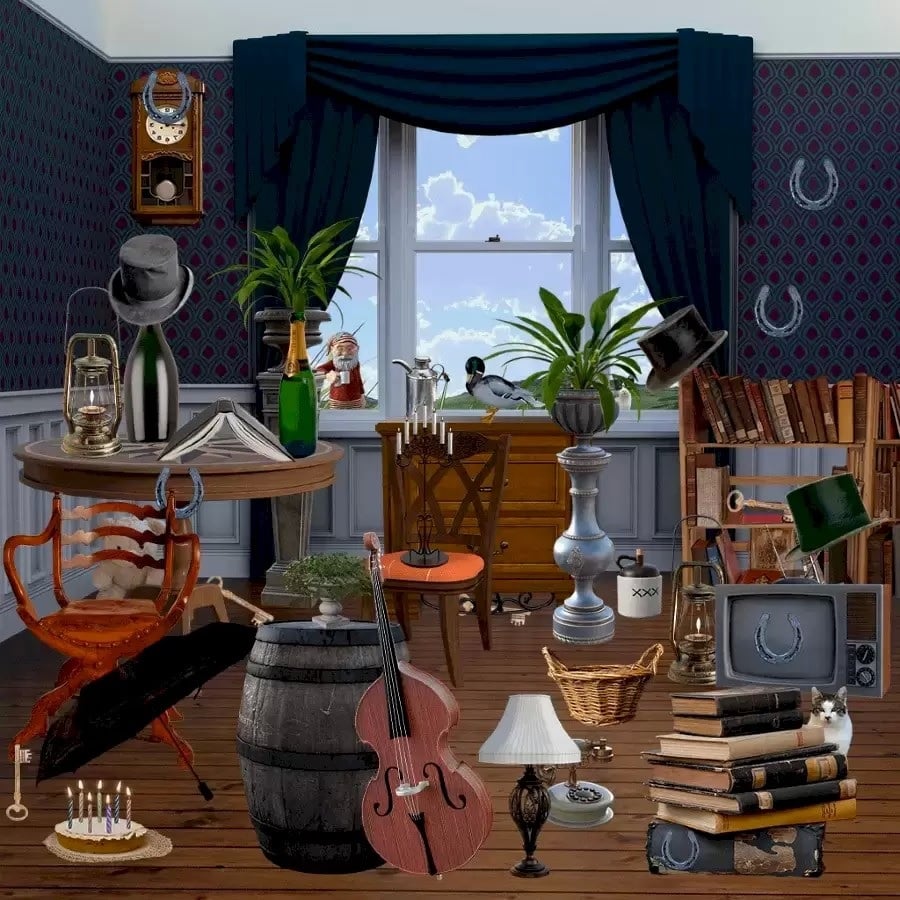 Wyobraź sobie, że wchodzisz do tego pokoju. Panuje tu artystyczny nieład – wszędzie książki, instrumenty, drobiazgi. To prawdziwy test dla Twojej uwagi i spostrzegawczości. Dwa małe futrzaki postanowiły się schować, a ograniczony czas tylko podkręca adrenalinę. Czy dasz radę je wypatrzeć, zanim czas upłynie?