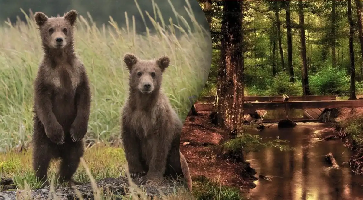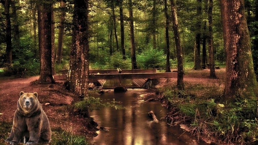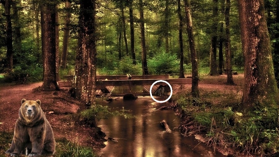 Gotowy na rozwiązanie? Niedźwiadek ukrył się znakomicie, wykorzystując kamuflaż. Nie stoi wśród drzew. Znajduje się na drewnianej kładce nad strumieniem, po prawej stronie obrazu. Jego ciemna, zwarta sylwetka niemal zlewa się z ciemnymi deskami i cieniami pod konstrukcją. Wygląda jak kolejna, nieco grubsza belka lub cień. To klasyczny przykład błędu percepcyjnego, gdzie nasz mózg, widząc strukturę stworzoną przez człowieka (kładkę), przestaje spodziewać się na niej żywego obiektu i traktuje ją jako jednolitą całość.