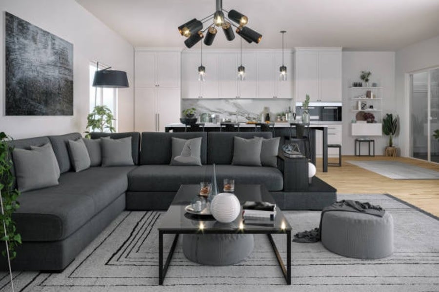 – Podpowiedź wyraźna: Jedna z szarych poduszek na kanapie ma nietypowy, opadający kształt. To nie jest poduszka.