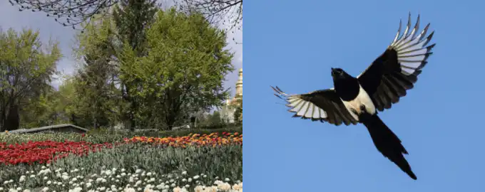Na obrazku pełnym kwiatów i zieleni ukrył się ptak. Kluczem do szybkiego znalezienia go jest nie tylko bystre oko, ale i logiczne myślenie – zastanów się, gdzie zwierzę.