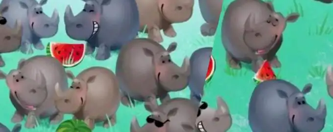 Wśród stada nosorożców ukrył się jeden hipopotam. Kluczem do jego znalezienia jest skupienie się nie na kształtach, a na detalach twarzy – jeden „nos”