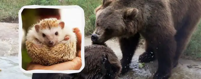 Na tym zdjęciu dwóch niedźwiedzi ukrył się mały, kolczasty drapieżnik – jeż. Jego doskonałe naturalne kamuflaż sprawia, że niemal zlewa się z otoczeniem.