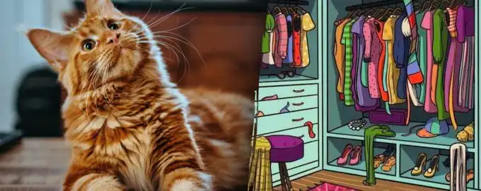 W zatłoczonej szafie pełnej ubrań i drobiazgów ukrył się pewien sprytny kot. Jego umaszczenie idealnie wtapia się w otoczenie, a kluczem do sukcesu jest