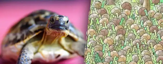 Wśród radosnych, uśmiechniętych żółwików ukrył się jeden sprytny intruz – wąż. Jego kamuflaż jest niemal doskonały, ale drobna różnica w wzorze i kształcie