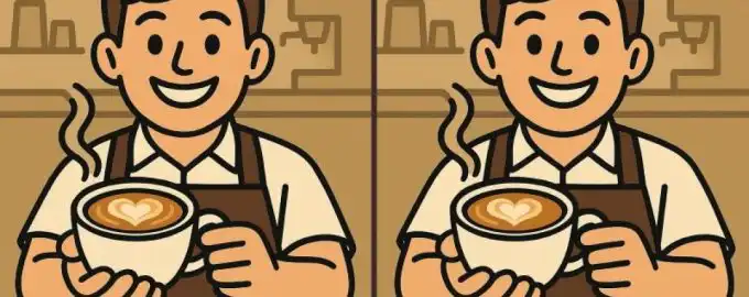 Dwa pozornie identyczne zdjęcia baristy kryją trzy subtelne różnice. Twoim zadaniem jest je odnaleźć, co wymaga nie tylko bystrego wzroku, ale i umiejętności