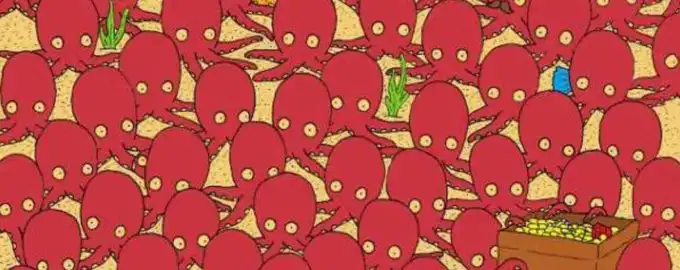 Wśród zatłoczonego dna morskiego, gdzie dziesiątki ośmiornic otaczają skarb, ukryła się jedna mała ryba. Twoim zadaniem jest dostrzec ją w zaledwie 7 sekund.