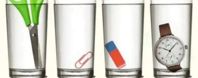 Na obrazku widzimy cztery szklanki z wodą, a w każdej z nich zanurzony jest inny przedmiot: nożyczki, spinacz, gumka i zegarek. Która szklanka zawiera