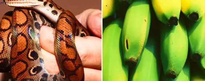 Wśród żółtej góry bananów czai się sprytnie zakamuflowany wąż. Jego głowa z charakterystycznymi kłami jest kluczem do rozwiązania – spróbuj skupić wzrok
