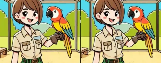 Przed Tobą klasyczna zagadka wizualna „Znajdź różnice”: dwa niemal identyczne obrazki z dziewczynką i papugą kryją trzy subtelne rozbieżności. Twoje zadanie?