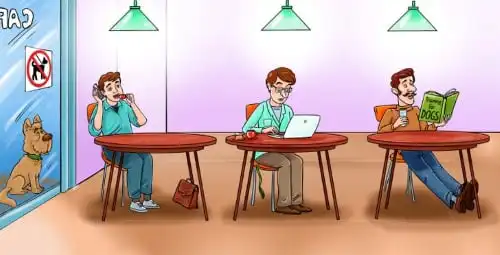 W kawiarni trzech mężczyzn, a pod drzwiami czeka pies. Który z nich jest jego panem? Kluczem do rozwiązania tej wizualnej łamigłówki jest szczegół, który