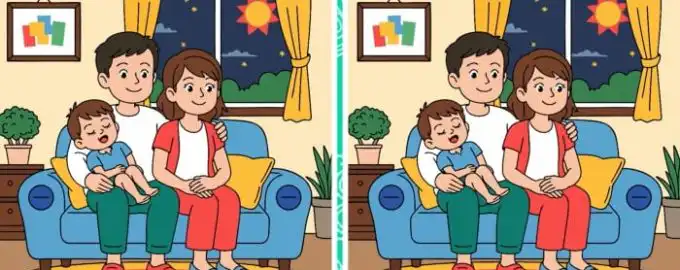 Na dwóch pozornie identycznych obrazkach sympatycznej rodziny w salonie ukryto trzy subtelne różnice. Twoim zadaniem jest je znaleźć, ale uwaga – kluczem