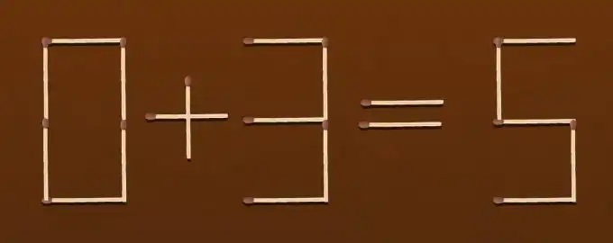 Twoim zadaniem jest naprawienie błędnego równania 0+3=5, ułożonego z zapałek, poprzez przestawienie tylko jednej z nich. Kluczem jest spojrzenie na liczby